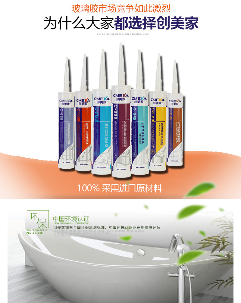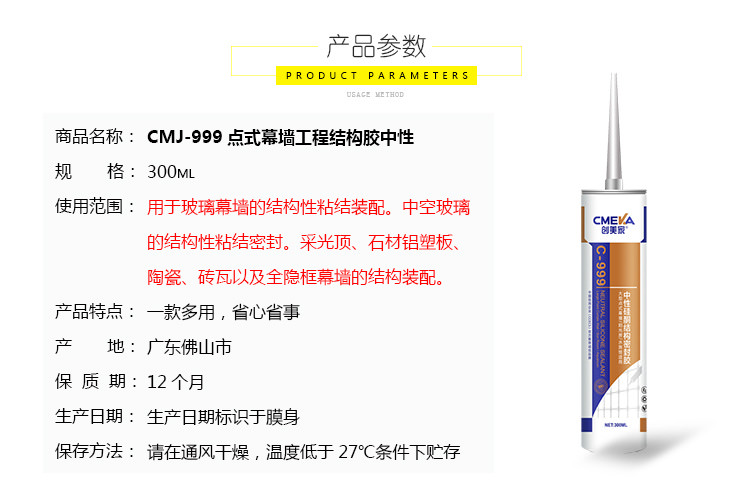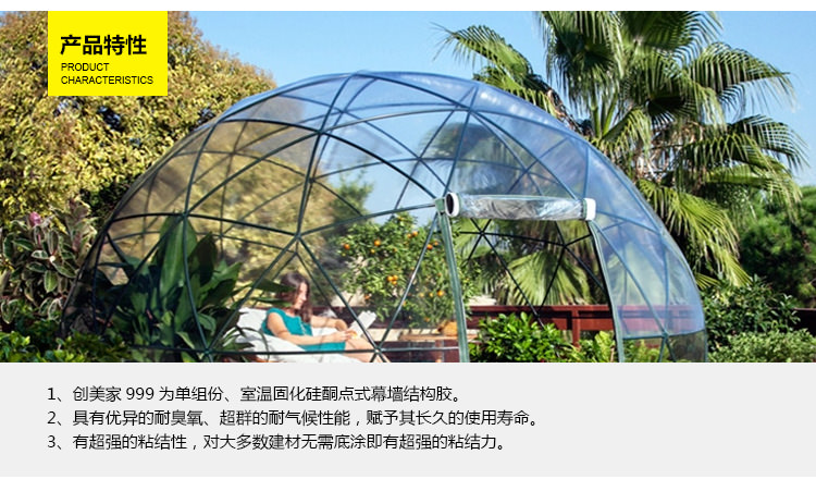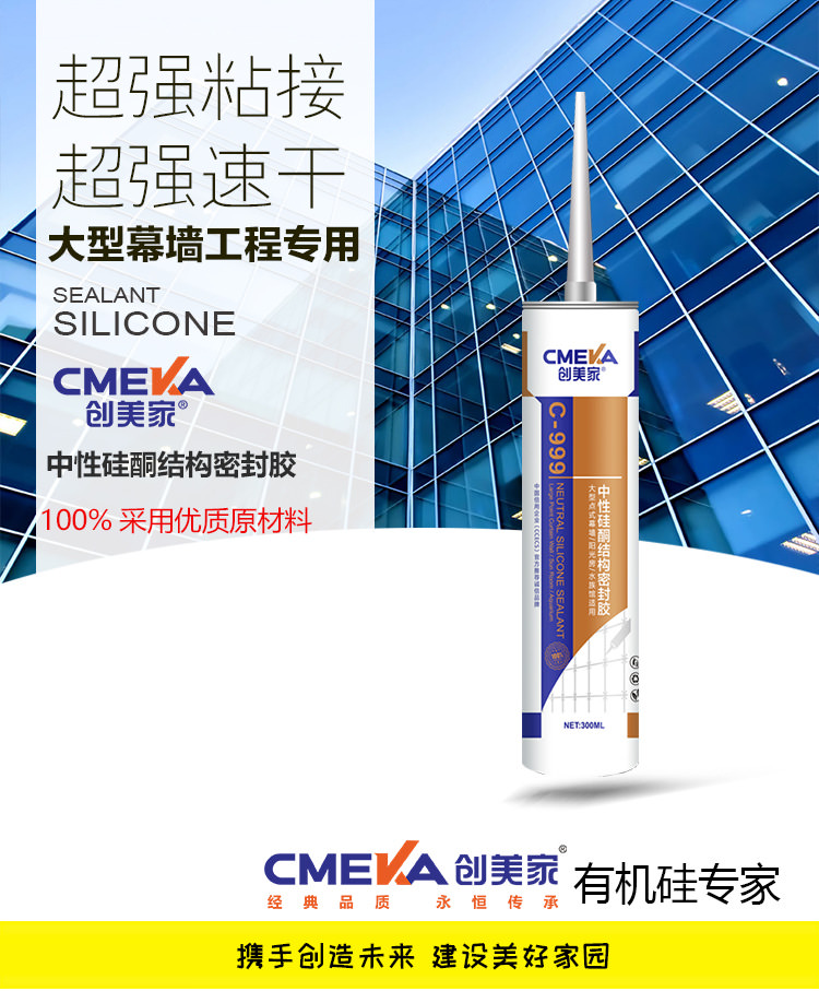 1、創(chuàng)美家C-999為單組份、室溫固化硅 酮點式幕墻結(jié)構(gòu)膠。